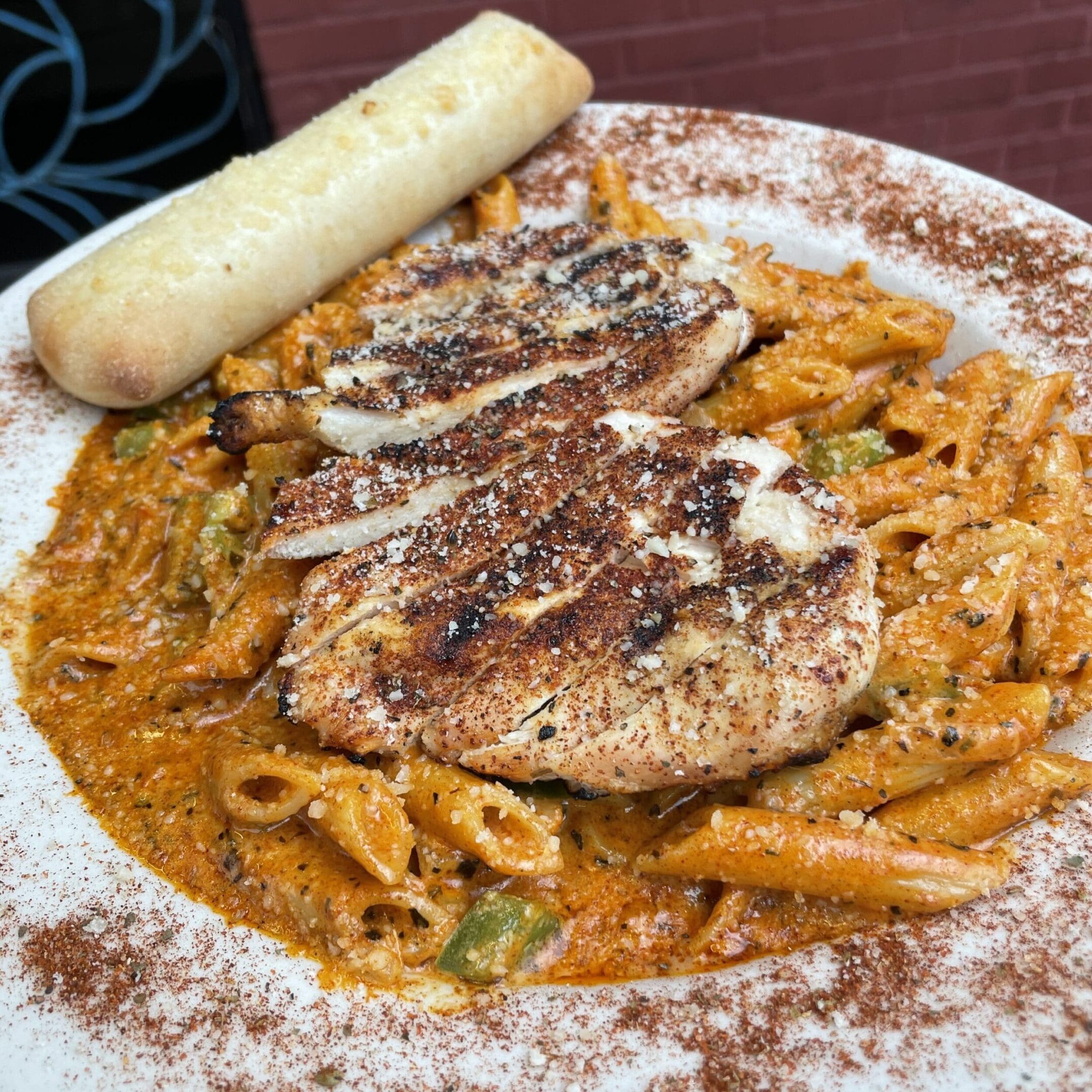 Sautéed peppers, onions, garlic tossed in a Cajun cream sauce with Cajun grilled chicken breast. Served with baked bosco stick.