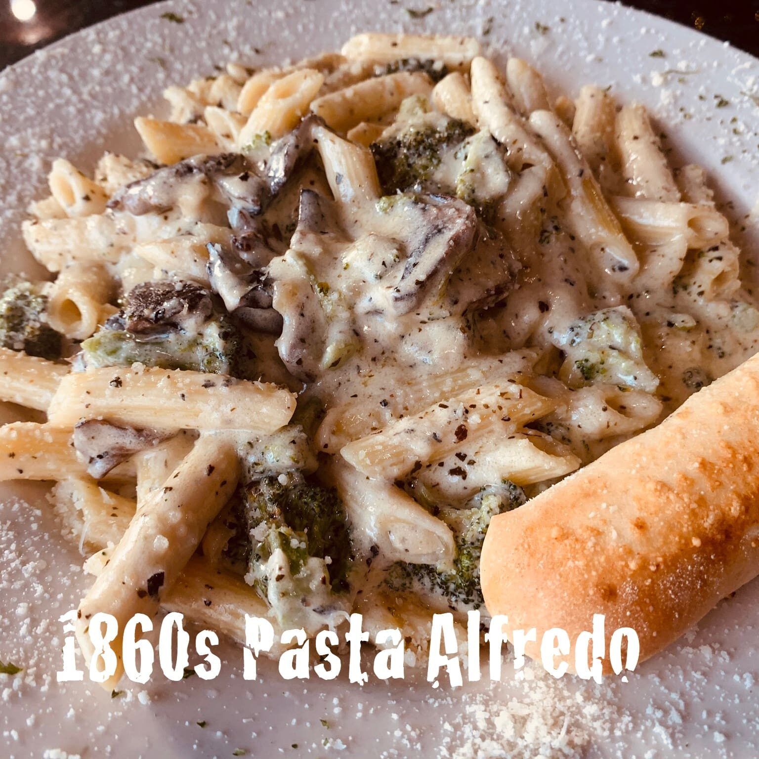 Penne pasta noodles in a rich, creamy alfredo sauce, with broccoli, mushrooms, and a touch of garlic. Served with baked bosco stick.