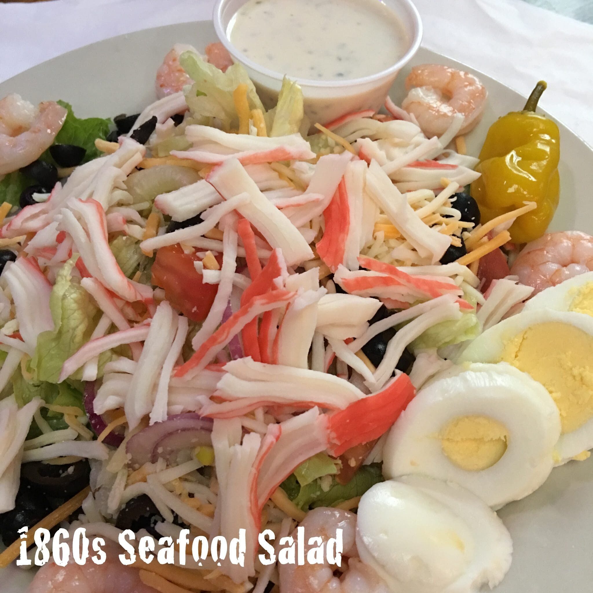 Fresh lettuce mix with shrimp, surimi crab, red onions, egg, black olives, tomatoes, monterey jack, cheddar and pepperoncini.